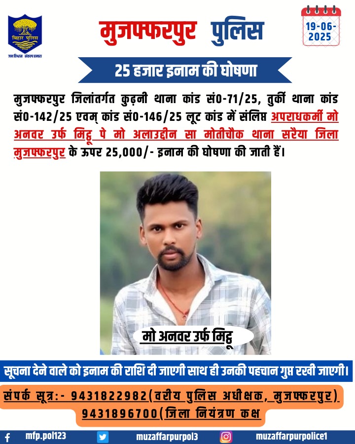 मुजफ्फरपुर पुलिस ने चार वांछित अपराधियों पर घोषित किया इनाम